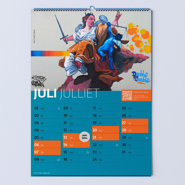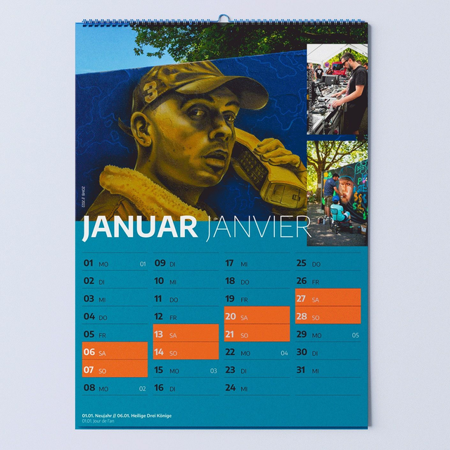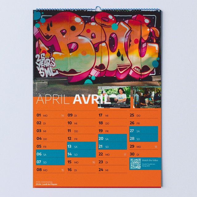 En achetant ce calendrier, tu gardes non seulement un œil sur tes rendez-vous mais tu contribues également au fait que notre association à but non lucratif puisse réunir les fonds propres indispensables à l'organisation de la Double Trouble - Graffiti + Turn- tablism Jam 2024 !